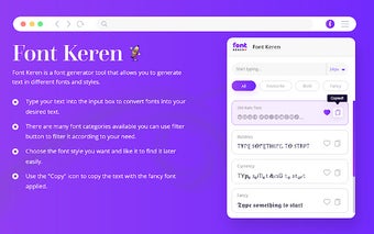 この拡張機能はリアルタイムの結果を特徴としており、ユニークなテキストスタイルを迅速に生成できます。ユーザーは、ワンクリックで希望のフォントを簡単にコピーでき、太字、斜体、または下線付きの文字を見つけるためにオプションをフィルタリングできます。さらに、Font Kerenには、将来の使用のために好みのスタイルを保存するための「お気に入り」タブが含まれており、オンラインでテキストの美学を向上させるための効率的なツールとなっています。